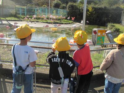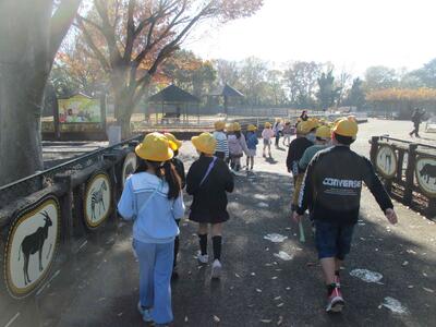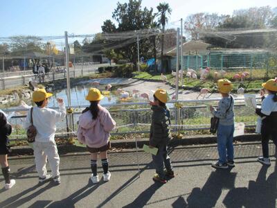 荷物を置いて、クラスごとの見学です。この後、班別の見学になるので、園内を子供たちがおおまかに把握できるよう、先生が目印になるポイントを伝えながら進みます。