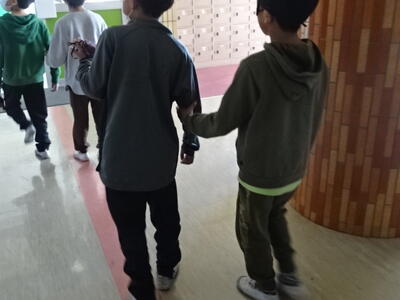 4年生は総合的な学習の時間に「考えよう、心のバリフリー」を学習しています。今日は車いす体験や、アイマスク体験をしました。車いすで段差を通ることや、自動販売機の上の方のボタンを押すことの難しさを体感しました。また、いつも通っている廊下でも、見えないと不安な気持ちやスムーズに歩けないことに気づいていました。気づきや学びの多い体験となりました。