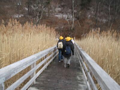 木道は、昨日の雪が解け、その水が再び凍っているところもありました。