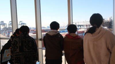 シャッターが開き、コンテナヤードが見えた瞬間、子供たちからは「すごい!」と歓声が上がりました。