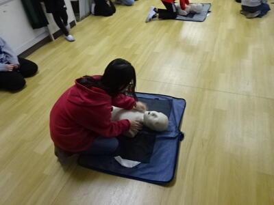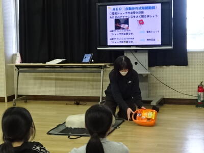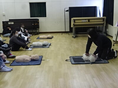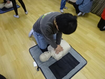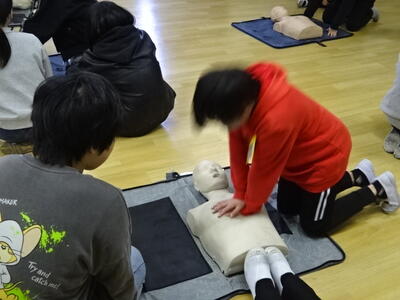 養護教諭指導のもと、心肺蘇生法を学びました。命を守るために大切なことはどのようなことなのか、自分で出来ることはどのようなことなのかを考えました。実際に3人組を作り、心肺蘇生を行う人・119番をして救急車を呼ぶ人・AEDを持ってくる人と役割分担をして行いました。