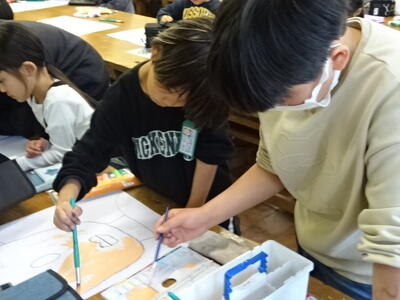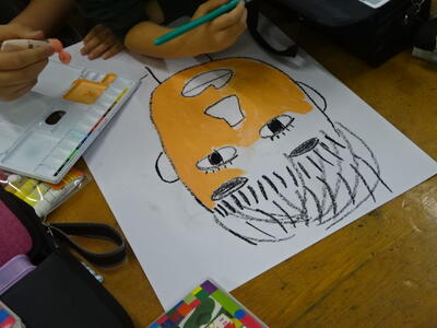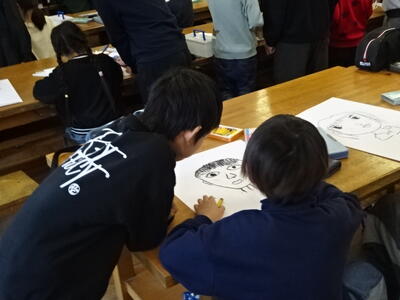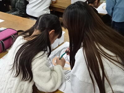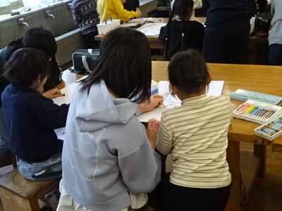 1年生が6年生の似顔絵を描きました。1学期にペア遠足へ行った、ペアのお兄さんお姉さんへのプレゼントです。1年生はお兄さん、お姉さんの顔をよく見てそっくりに描きました。6年生は優しく手取り足取り教えていました。一緒に描く姿がとても微笑ましく、温かい雰囲気でした。