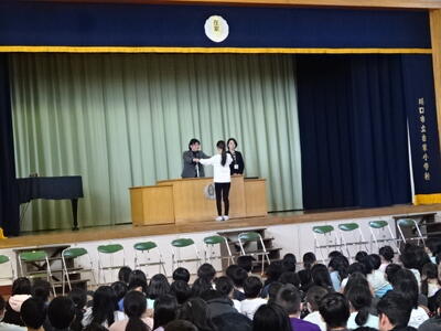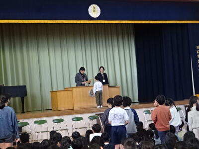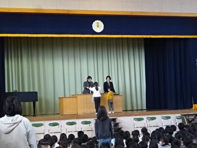 図工の作品の表彰がありました。2人の代表児童が校長先生から賞状をもらいました。