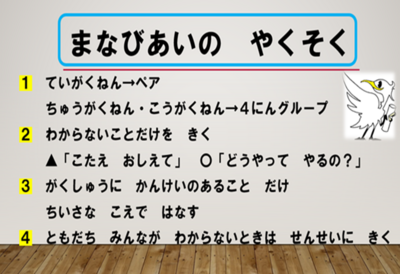 今年度の9月の始業式には校長先生から全校児童に向けて、「学びの共同体スタイルの授業」について講話がありました。その後、各学級で『まなびあいの やくそく』をもとにした授業を実践しています。